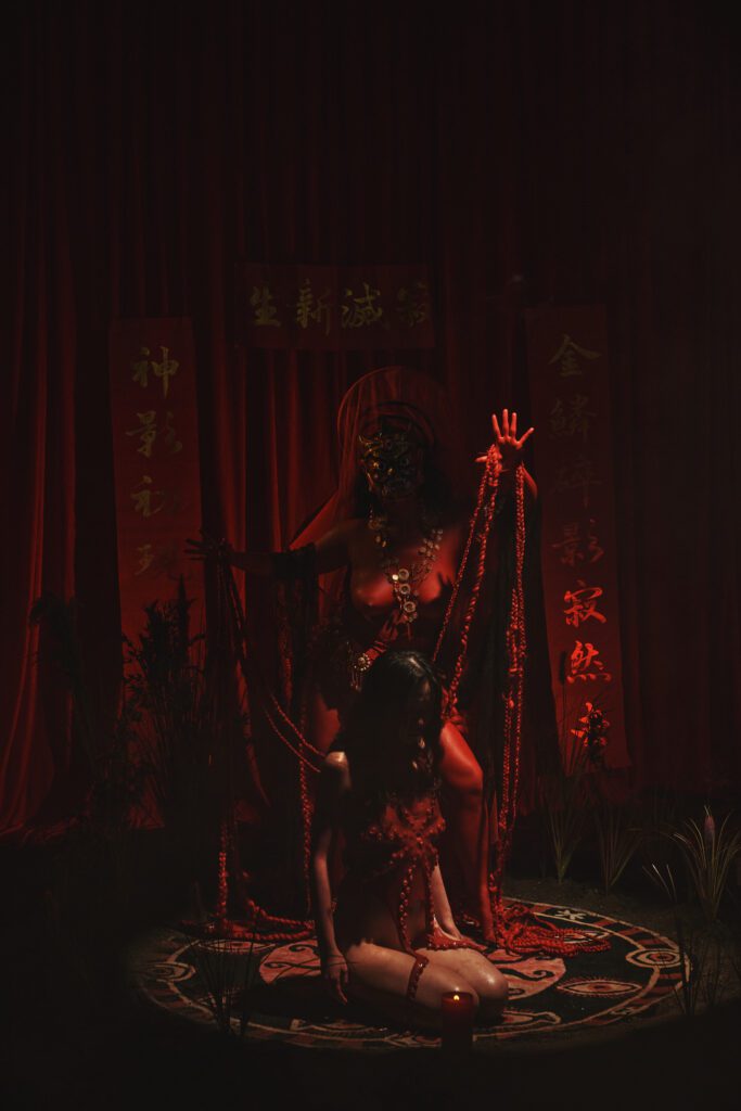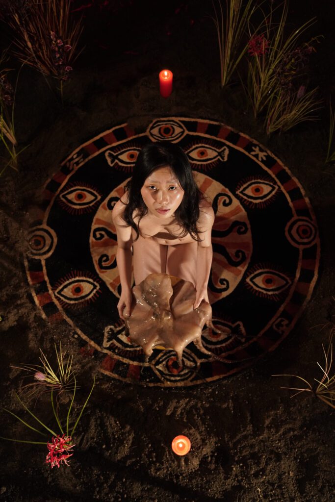 Pisces draws from the Lovecraftian mythos, Chinese folk ritual, Five Elements theory, and the artist’s own intimate history. Through the visual language of cult aesthetic, it portrays a process of psychic integration—a trinity of shadow, anima, and self.