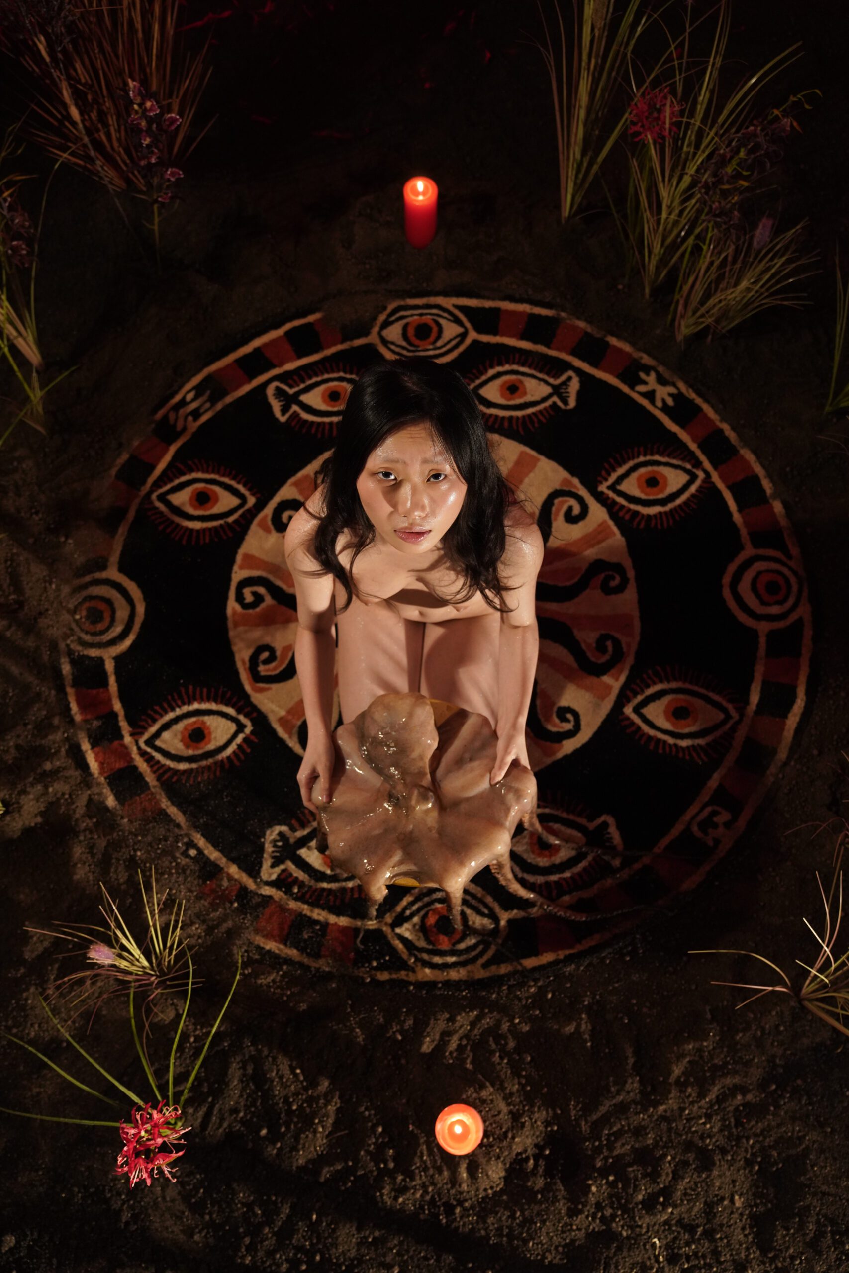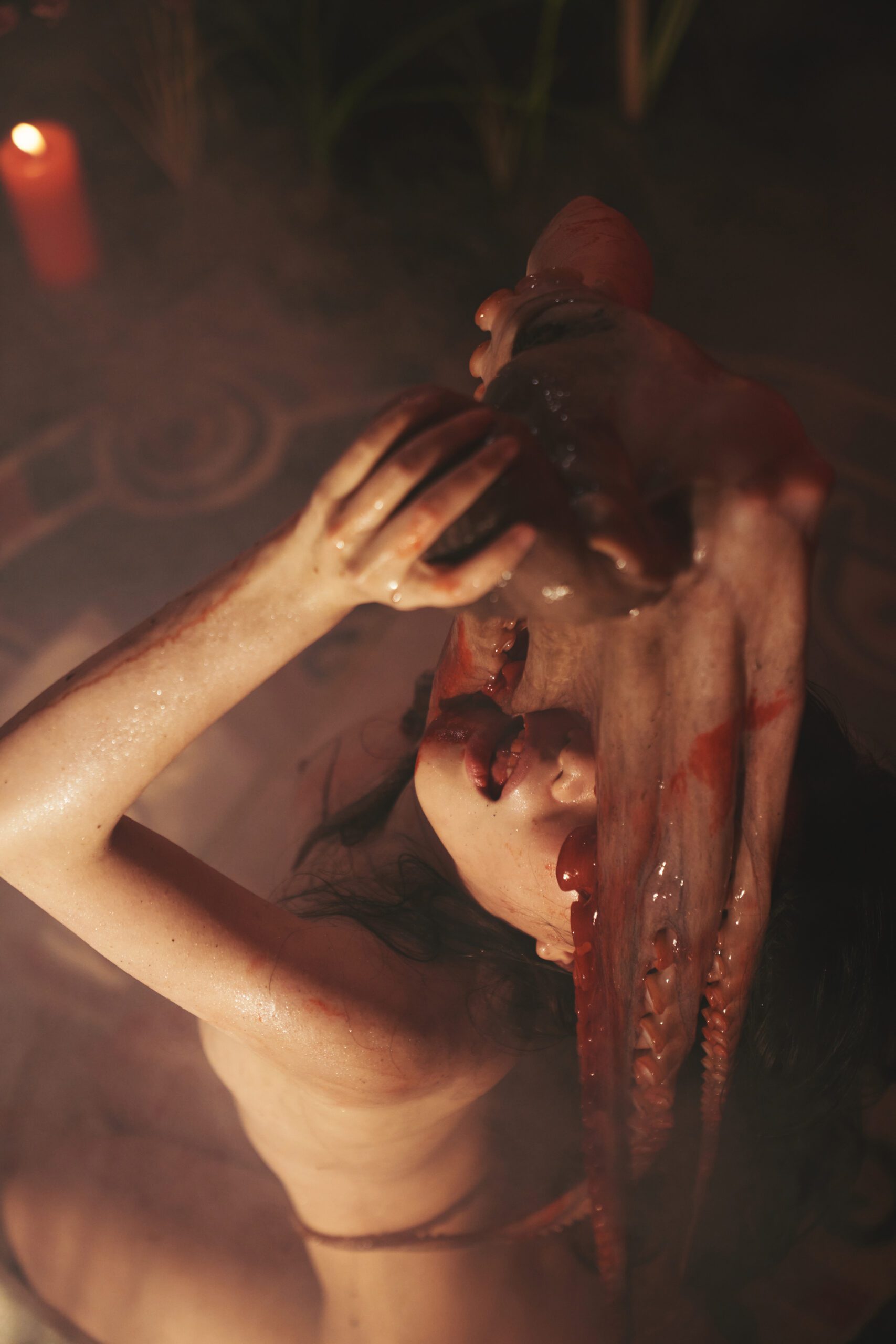 Alone, she lights a fire and burns her clothes. The ritual begins. Candles, carpets, and an octopus mark the ceremonial space. Blood spreads across her face; the octopus’s tentacles entwine with her in a strange, intimate communion.