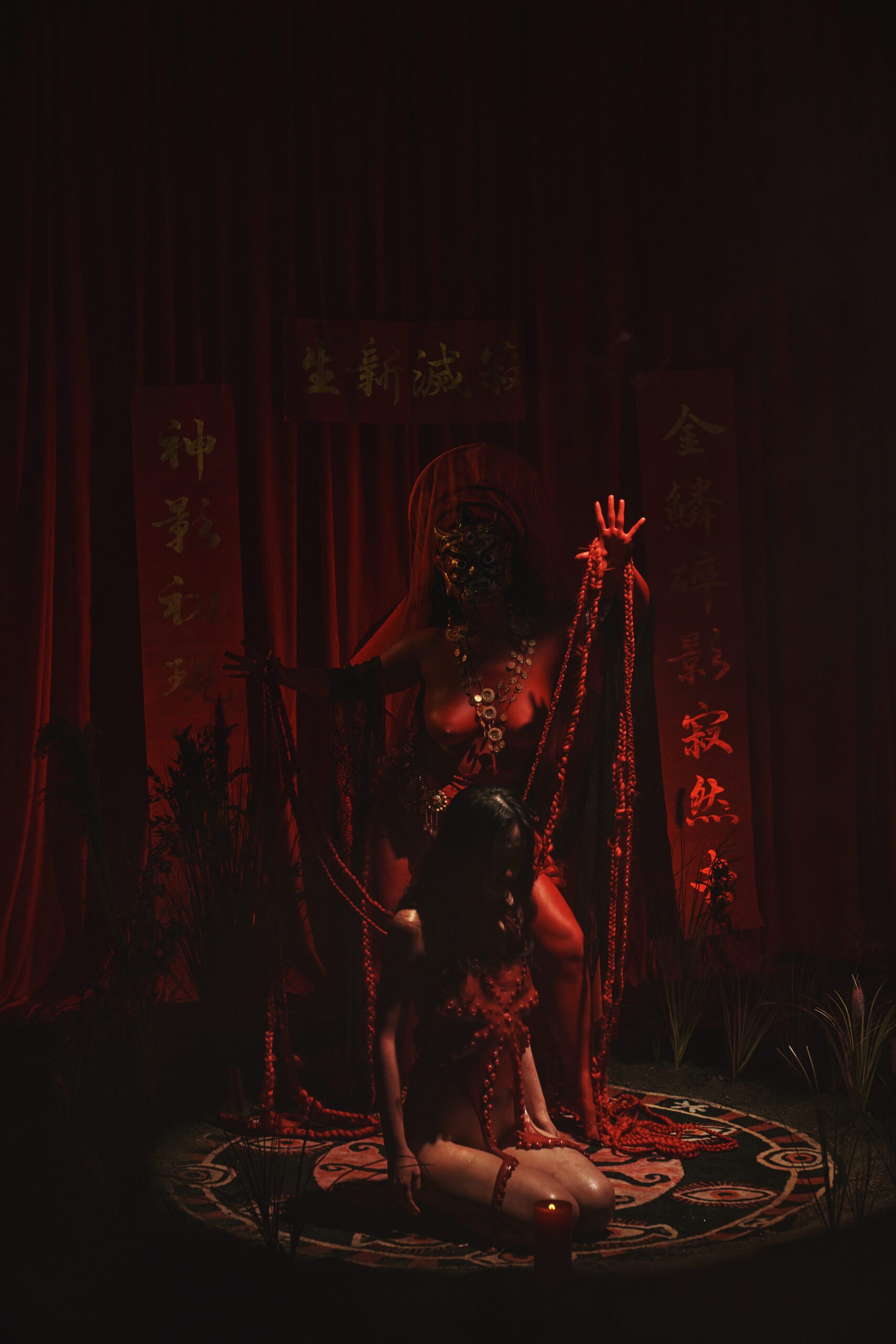 独处时,她点燃火焰,焚烧自己的衣物——仪式由此开始。蜡烛、地毯与章鱼勾勒出祭仪的场域。鲜血在她的脸庞蔓延,章鱼的触须与她交缠,形成一种奇异而亲密的交流。